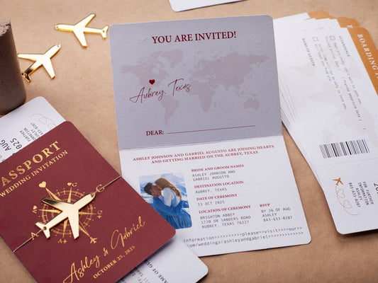 Gold Foil Passport Wedding Invitation for Destination Wedding with Boarding Pass Style