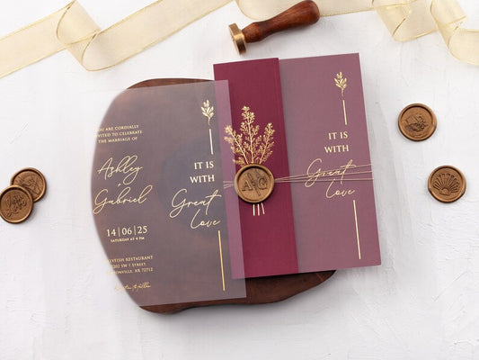 Gold Foil Acrylic Wedding Invitations with Folded Envelope,